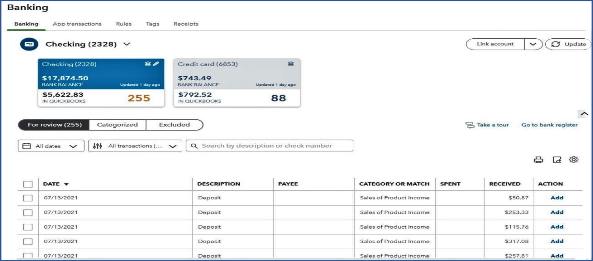 QBO has a protective feature that holds the transactions on the banking page like they are still sitting on your bank statement until you add them to your books. Until you move transactions from bank feeds to your books, they are not in your books. Using this feature intelligently will prevent hours of troubleshooting later. I will refer to this holding area as bank feeds throughout this article.