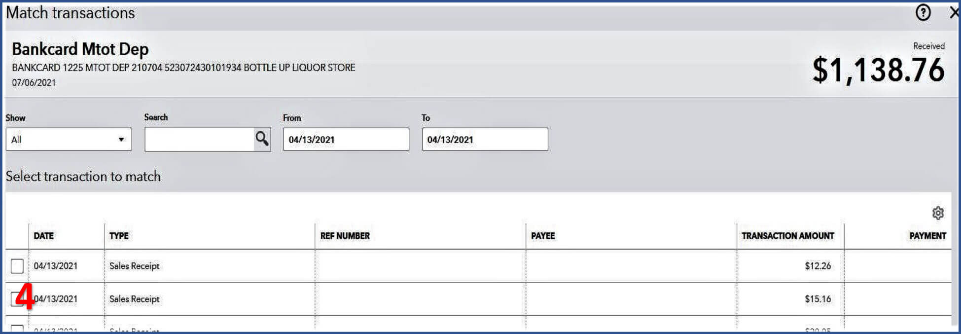 Scenario 1: Deposits tied to multiple sales receipts or invoices. (Matching transactions to Invoices create a receive payment.)