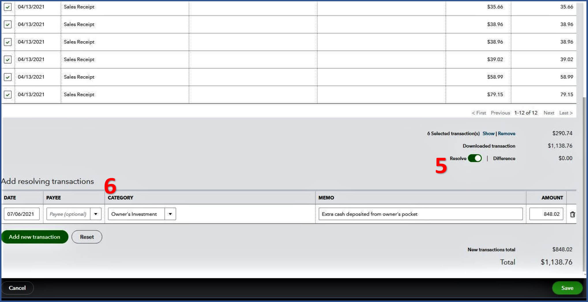 6. Add resolving transactions line appears.